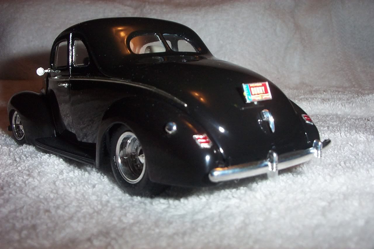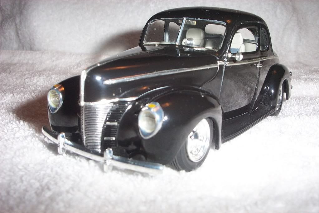 In the mid 90's I decided that I wanted to build another AMT '40 Ford Coupe. I hadn't built one since they were first released in the early 60's. I then remembered an article I had read in an issue of Scale Auto Enthusiast (July/August 1984) magazine and in that article the author had used a frame from another kit to update the '40 front suspension to independent, an obvious upgrade at the time. I decided to give it a try and it turned out to be a very easy swap. The author (Eric Hartlep) used the frame and front suspension from an AMT Ford Courier Pick up truck to update an AMT '40 Ford Sedan. I just followed his article and it worked out very well. I used the Courier front suspension and a kitbashed rear/suspension from my parts box. You notch the front splash aprons on the '40 and the deeper the notch, the lower you can get the front end. After locating the front suspension you simply adjust whatever rear end/suspension you chose and with a little trimming of cross-members, that's all their is to it.