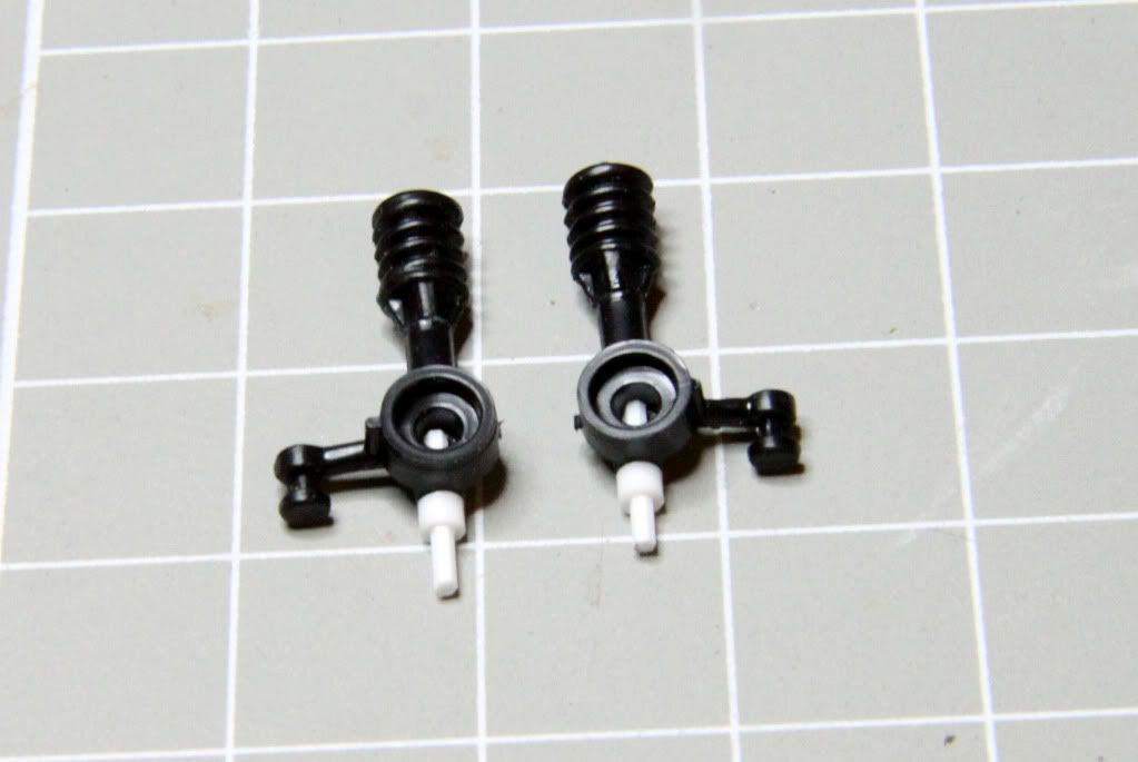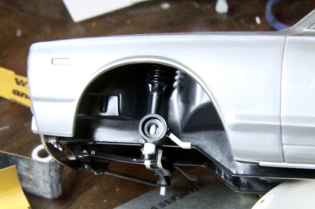 I wanted a lowered stance, so I modified the front and rear. Front was simply cutting the strut into two parts and moving the wheel mounting spot up a couple scale inches. The bottom was filled with round styrene. The parts to connect to the steering rod are just scrap parts..